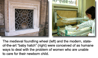 The draft resolution notes the reintroduction in some countries of the idea of the "foundling wheel" system, first pioneered in Catholic countries in the middle ages, that allows mothers to leave their children in the care of modern medical facilities with subsequent access to social services and adoption without identifying themselves. Modern "baby hatches" in hospitals or social centres are safe for the child and include sensors that alert workers when a baby has been put in it. In Germany, babies are first cared for for eight weeks, during which time the mother can return and claim her child without any legal repercussions. If this does not happen, after eight weeks the child is put up for adoption.