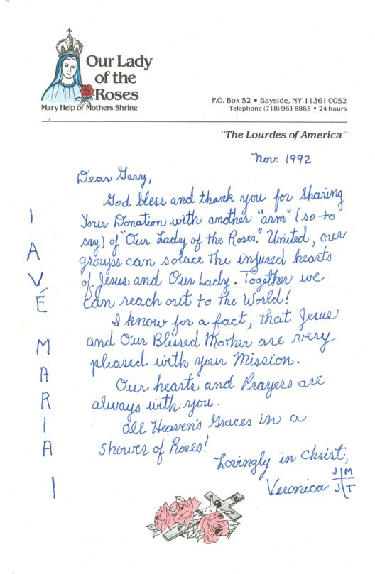 Here is a beautiful letter Veronica sent to TLDM in 1992. We were blessed to know and work with Veronica over the years, and we know she will one day be canonized a saint of the Catholic Church: