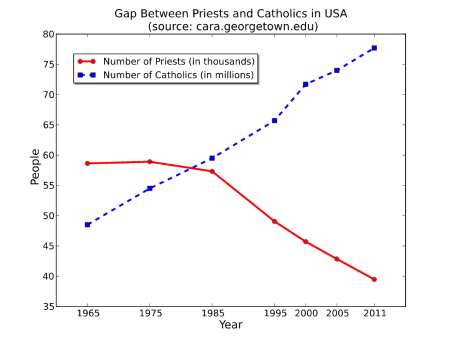 In 1975, there were 58,909 priests in the United States. Today, Georgetown's CARA puts the figure at 39,600, a 33 percent drop. Meanwhile, America's Catholic population rose from 54.5 million to 78.2 million, a 43 percent increase, during the same period.