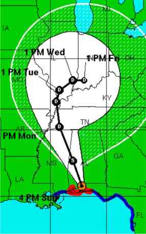 By 5 p.m. EDT, Dennis was about 20 miles north of Pensacola and had weakened to a Category 2 storm with top winds of 105 mph. As it moved inland, the hurricane's next-biggest threat _ tornadoes _ took over. Tornado watches and warnings were posted as far north as Montgomery, Ala. Forecasters also warned that hurricane-force winds may occur 150 miles inland, along with the threat of up to a foot of rain as Dennis travels north through Alabama, Georgia, Mississippi and Tennessee into the Ohio Valley.