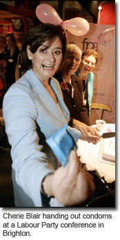 “She (Blair) honoured the 75th anniversary celebrations of Britain's Family Planning Association [FPA] … as the special celebrity guest,” observed Bogle, “cutting the celebration cake and being photographed brandishing a condom.”