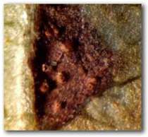 Scouting requires looking through a magnifying glass at the underside of bottom leaves on a plant before the plants form a canopy between rows. Continued surveillance is needed into the growing season. The task is to find small yellow, flecking spots on the underside of some leaves on the lower part of the canopy. As the rust matures, it turns into very small, reddish-brown to dark brown dots. Pustules form on lower leaves and kill leaf tissue. The pustules eventually act like tiny volcanoes, discharging hundreds of thousands of spores from a plant. It takes a hand lens to view the pustules.