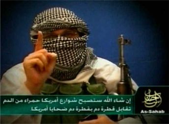 The terrorist's face is concealed by a headdress, and he speaks in an American accent, making it difficult to identify the individual. The tape appears to be from al-Qaeda's media liaison organization. It has a banner crediting the Sahab Production Committee. The speaker refers to Bin Ladin and Zawahiri as "our leaders" and praises the 11 September attacks.