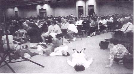 Bleasdell also employed the well-worn Pentecostal mesmerism: "some of you experience that you don't have a headache any more...raise your hand.", etc.,etc." At one point, Father Scanlon, obviously overwhelmed with enthusiasm, seized center stage and addressed the crowd as if in the grip of a dream: "I almost never get visions but I can see God's hand moving down inside of so many in this assembly and reaching in and grabbing the garbage ...grabbing the garbage. (rising to a shouting crescendo) Let Him PULL IT UP! GET RID OF IT. SEND IT UP NOW -- SEND IT OUT. THE HOLY SPIRIT'S GONNA REPLACE IT! GARBAGE OUT -- HOLY SPIRIT IN!!" The crowd responded with "Praise God, Praise Jesus, Alleluia, Alleluia," There would be time for the entire congregation to join in "healing prayers."