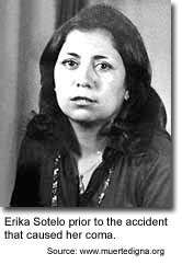 Erika Sotelo has been in a coma since 1995, when the anesthesia given to her for a hysterectomy caused her heart to stop beating.  By the time doctors revived her, Sotelo's brain had suffered damage due to oxygen deprivation. She has never recovered complete consciousness.