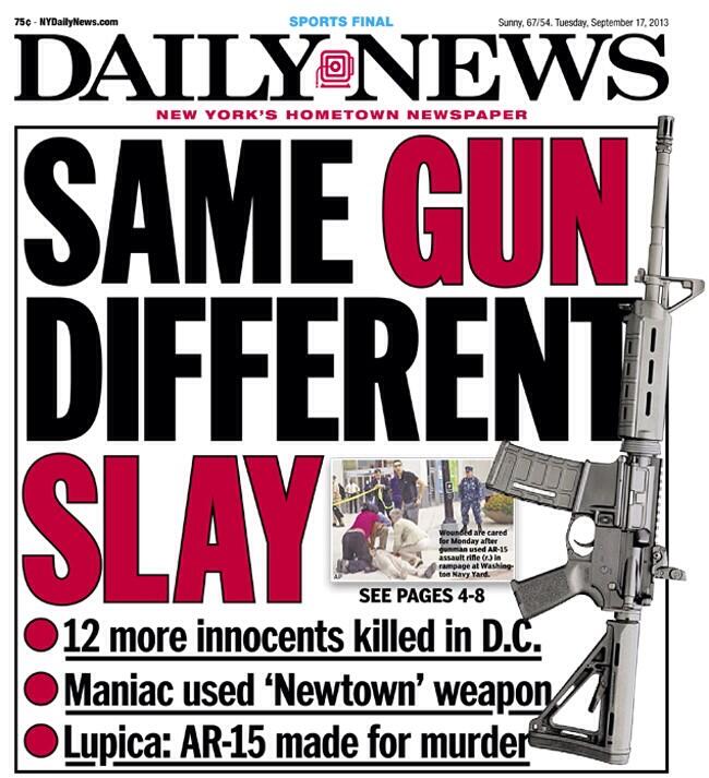Despite there being no evidence that an AR-15 was used, the New York Daily News ran a front page headline yesterday morning entitled, “Same Gun Different Slay,” next to a picture of an assault rifle.