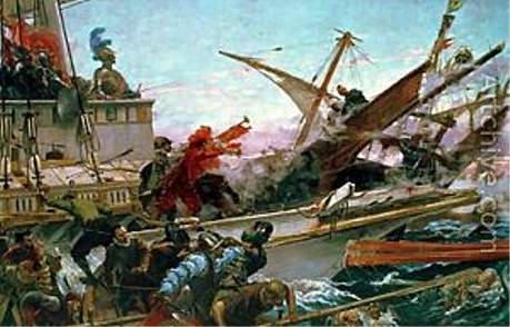 Then a great convulsion takes place. All the enemy ships scatter, collide and break to pieces one against another. Several small ships that had fought gallantly for the Pope race to be the first to bind themselves to these two columns. Many other ships watched the battle and afterwards they also fastened to the two columns. The a great calm then came over the sea.