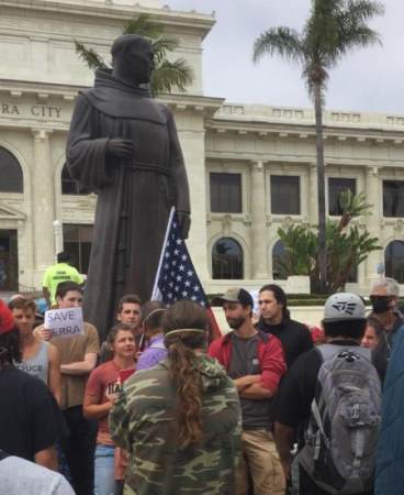 At 1 PM, anti-Serra demonstrators, about 200, gathered near the statue of the saint, located in front of Ventura’s city hall, where they began a rowdy demonstration.