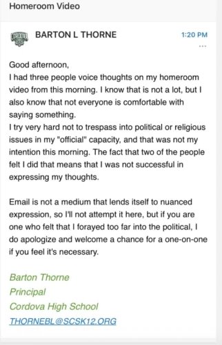Thorne was almost immediately suspended by the Shelby County School district, pending an official “review” of his totally innocuous comments. Thorne later drafted an email apology, bowing for his transgression against the authority of tech oligarchs.