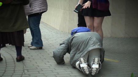 As the young activist continues her ranting, the elderly woman approaches her, kneels down on the sidewalk, and kisses her feet.