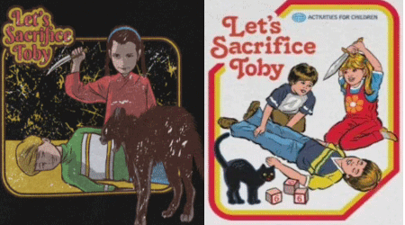 And Etsy is allowing quite a few vendors to sell versions of this shirt. Here’s one more.This is dangerous and too much! The “Let’s Sacrifice Toby” shirt unmistakably trivializes and promotes child sacrifice and Satanic murder child-to-child; many children might think it’s a fun thing to do.