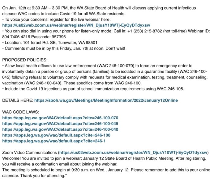 The Washington State Board of Health will hold a virtual public meeting on January 12 to discuss the application of W 246-100-040.