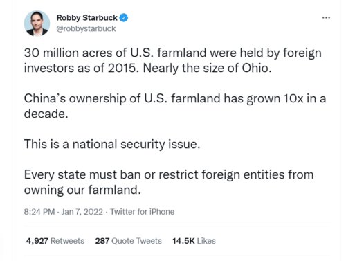 Our farmland is critical to our survival. Giving control of it to a communist entity is beyond stupid. It’s dangerous. They‘ll never let us control their farmland. This practice must end. US farmland should be owned by US citizens. Protect our food supply and put Americans FIRST!”