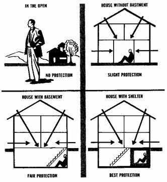 With more time, materials, and carpentry or masonry skills, you could even construct a more formal fallout shelter, such as the FEMA lean-to on the right, but you will need to assure structural integrity is achieved and adequate mass is utilized.