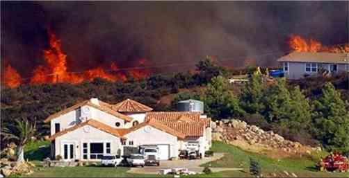 HEART  OF  THE  AMERICASFirefighters try to protect two homes on a remote hillside in Bear Valley, south of Valley Center, Calif., on Monday. A state of emergency was declared in Los Angeles, San Bernardino, San Diego and Ventura counties as the fires laid to waste entire blocks of homes, closed major highways and roads, shuttered some schools, disrupted air travel nationwide, and literally sent people running for their lives.