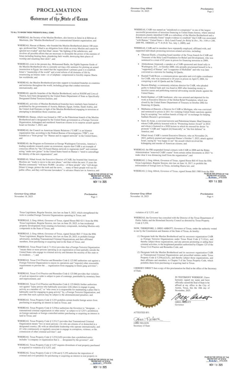 Here’s what it formally triggers under Texas law:1. Designates Muslim Brotherhood & CAIR as Foreign Terrorist Organizations