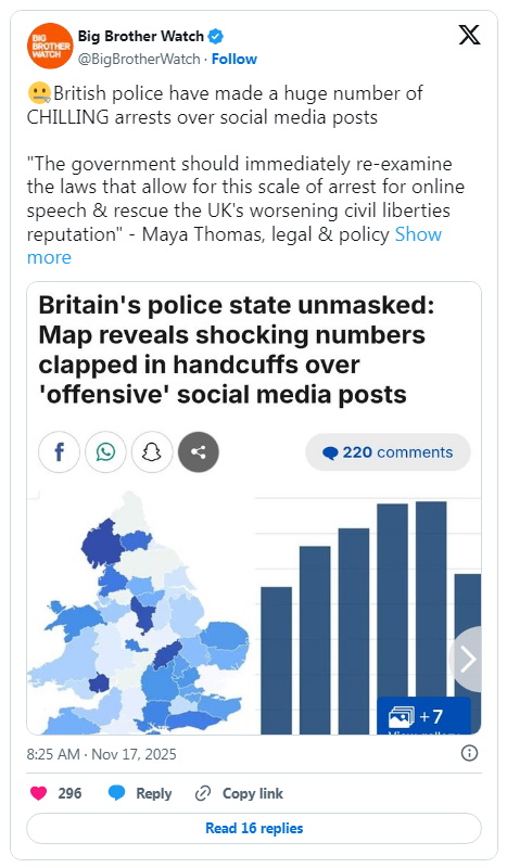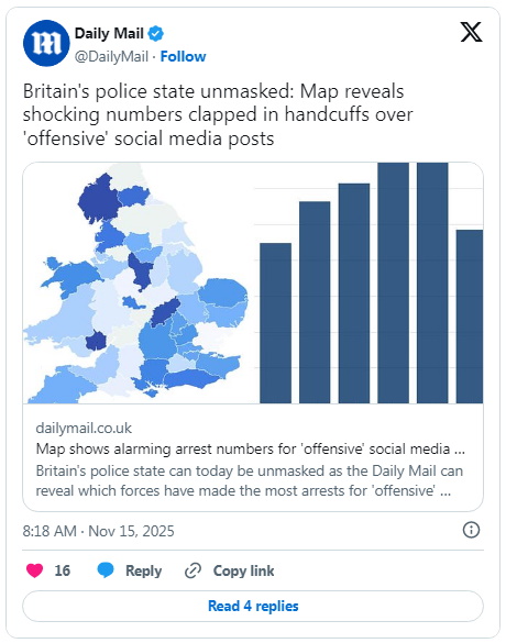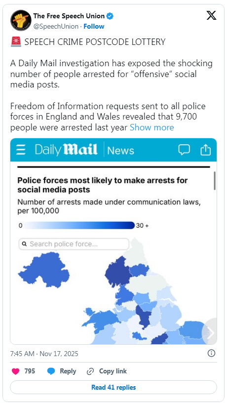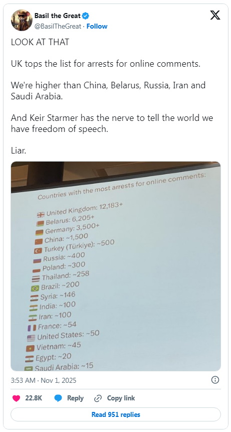 As we reported earlier this year, Britain now averages 30 speech arrests daily—Toby Young of the Free Speech Union described it as “a national scandal” and warned the UK is becoming “the North Korea of the North Sea.”