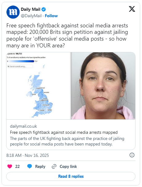 The map spotlights absurd prosecutions, like comedy writer Graham Linehan’s 2025 Heathrow arrest by five armed officers for three gender-critical tweets; a 71-year-old ex-cop detained eight hours for mocking a pro-Palestine activist, with officers mocking his “very Brexity” books; and parents raided at dawn over “sarcastic” school emails, held for 11 hours in front of their crying daughter, with eventually no charges filed.