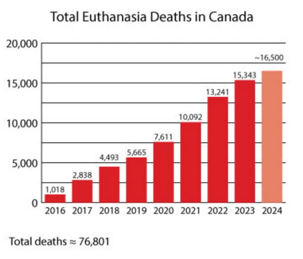 Canada has now crossed a line most of us never thought possible. By the end of 2024, there were roughly 16,500 euthanasia deaths, that representing 5% of all deaths in the country.