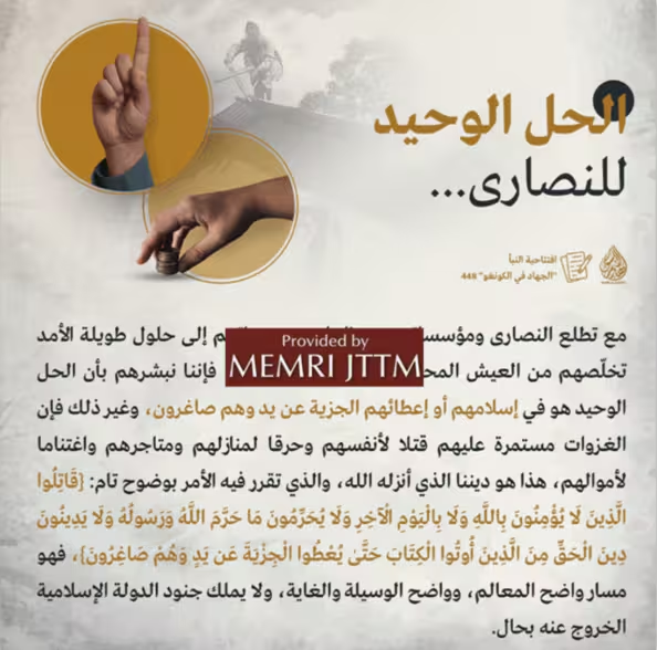 Highlighting how jihadis are targeting Christians, the pro-ISIS Hadm Al-Aswar Foundation released a poster on its Telegram channel titled "The Only Solution for Christians." The August 2024 image depicted an ISIS operative removing a cross from a church roof, a raised index finger symbolizing Islamic monotheism – a gesture commonly used by ISIS – and a hand appearing to pay the jizyah. The poster included text from an editorial titled "Jihad in the Congo," published in Issue 448 of the ISIS weekly Al-Naba, in which ISIS issued an ultimatum: Christians must "either convert to Islam or pay jizyah; otherwise [ISIS] will continue to execute them, burn their homes and businesses, and plunder their properties." It concluded with the statement: "The path is clearly defined with its means and goals, and the soldiers of the Islamic State cannot deviate from it."
