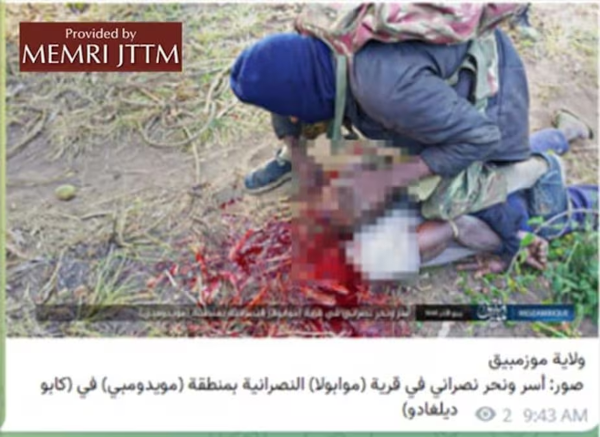 [10] MEMRI Special Dispatch No. 12196, WARNING—GRAPHIC: Islamic State Mozambique Province (ISMP) Documents Beheading, Shooting Christians, Burning Churches And Homes In Country's North; Over 30 Beheaded In September, October 2, 2025.