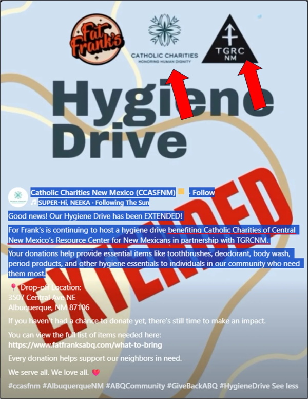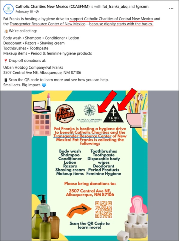 On March 10, CCASFNM posted an update on the hygiene drive, indicating that the drive would benefit Catholic Charities’ “Resource Center for New Mexicans” and that this was “in partnership with TGRCNM” (the Transgender Resource Center of Central New Mexico).
