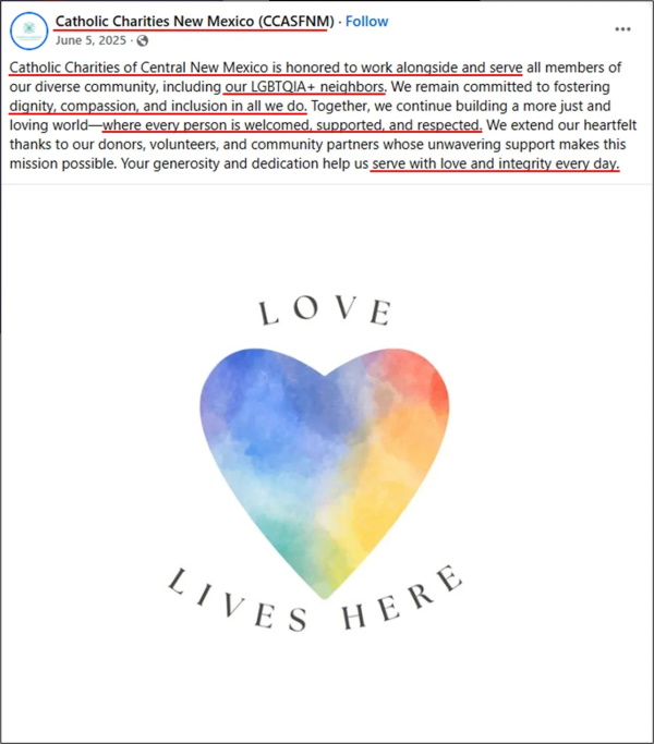 For instance, on 5 June 2025, CCASFNM posted a rainbow colored heart with the message “Love Lives Here,” while affirming its “LGBTQIA+ neighbors.”
