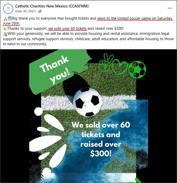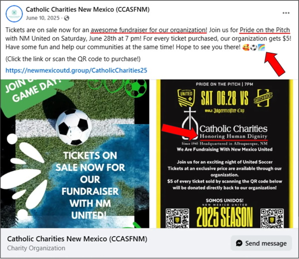On 10 June 2025, CCASFNM posted a fundraiser through something called “Pride on the Pitch,” scheduled to take place on 28 June in partnership with New Mexico United. The tagline for the fundraiser is “Honoring Human Dignity.”