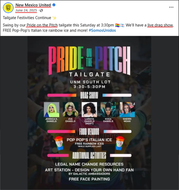 The 24 June 2025 Facebook post by New Mexico United about the same event makes it abundantly clear that this is an LGBT event that included a “live drag show.”