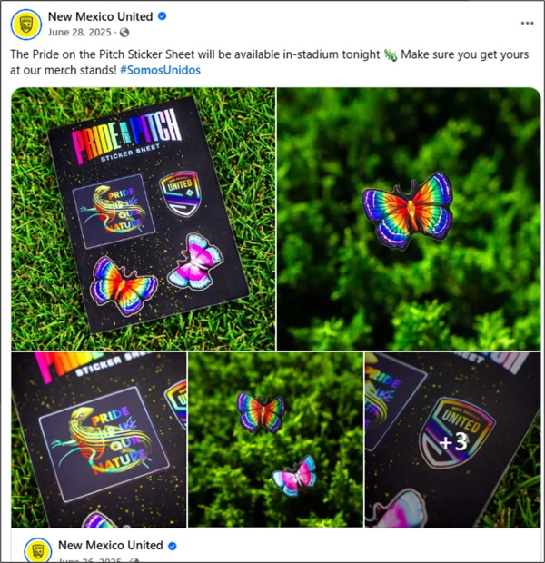 New Mexico United – with whom CCASFNM partnered on Pride on the Pitch – posted pictures of an LGBT-themed sticker album being distributed at the event. Among the stickers is one that said, “Pride is in our Nature.”