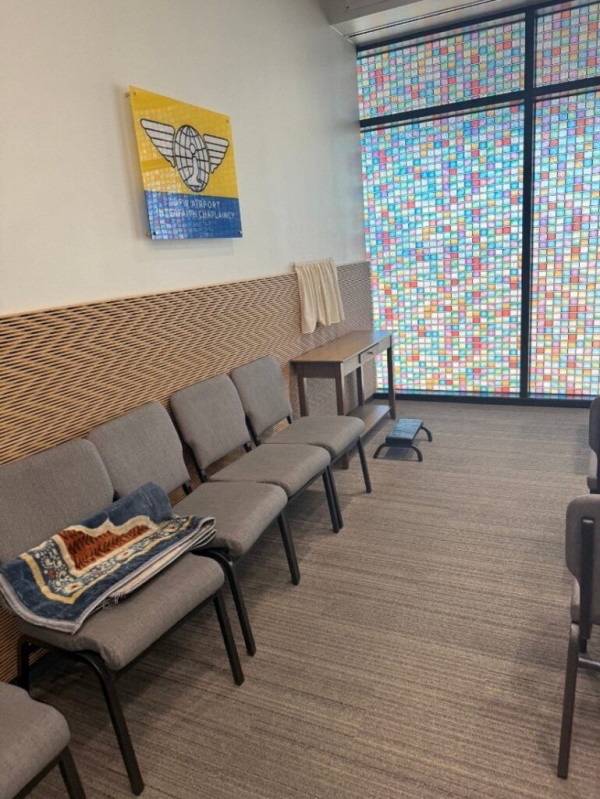 When I arrived, there was one man already in the room. He had on an employee uniform and was a luggage handler or something similar. He had his shoes off, as if he’d just finished praying, and he was chilling out on the chairs watching a video on his phone. I was surprised to see him and surprised to hear his phone playing in a sacred space.